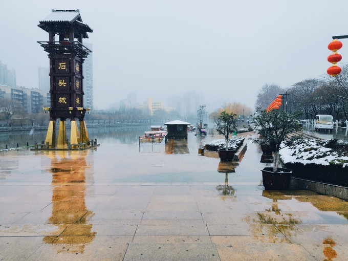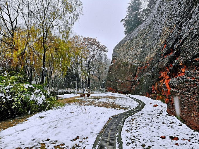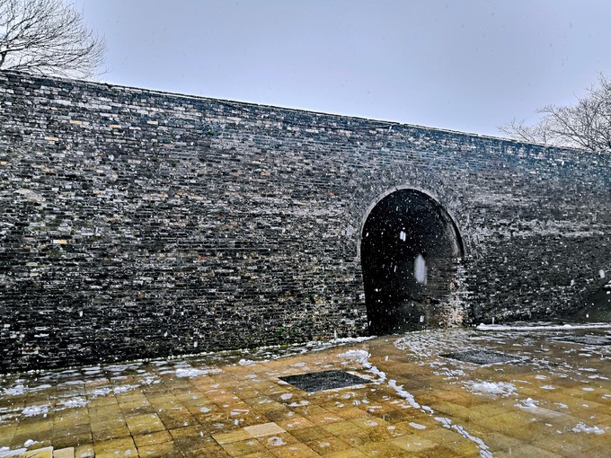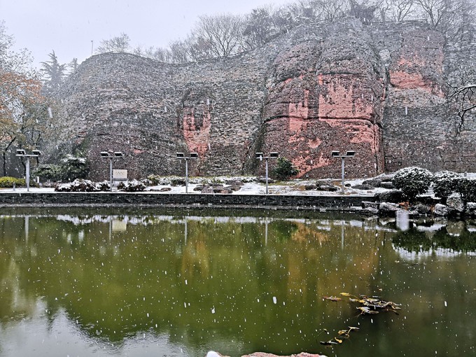 “石城霁雪”最早出自明代万历年间南京状元朱之蕃诗记、陆寿柏作画的《金陵四十景图考诗咏》,朱状元描绘石城雪景云:“江天顿改寻常色,庐井都无一点尘。”说的是雪后天晴,登临石头城眺望长江以及江滩上村落人家的景象,石头城驻高临下,江渚平野一望无际,冬阳照雪,雪映天光,可谓寻常看不到的奇景。现南京博物院还藏有同时期江宁画家郭仁绘的《金陵八景图卷》,第二景为“石城瑞雪”!如今的石头城早被城市高楼所“山围故国”,再也难见当年江天一线的佳景了。好在石头城还在,秦淮河还在,当瑞雪降临,我们可以换一个角度,隔着秦淮河回望 “石城霁雪”,看雪后苍茫的石头城,看为雪白头的清凉山,一定能找到我们这座古都的乡愁。 而除了“石城霁雪”这里还有一处风景就是“鬼脸照镜”一尊隆起的城墙砖犹如一面鬼脸,它的故事之前也介绍过过,所以石头城又名鬼脸城!早年还拍过电影《庐山恋》。
