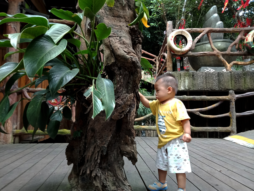 导游说槟榔谷是真正意义上的海南本土文化的聚集地,它的一切东西都是原汁原味的“海南味”。本土居民最大的特征是“雕题离耳”。所谓的“雕题”就是纹脸,即在脸上刻图案;“离耳”就是耳朵上佩戴大的耳环。在槟榔谷,具备这些基本特征的海南人处处可见,成为一道珍贵的人文风景线。
