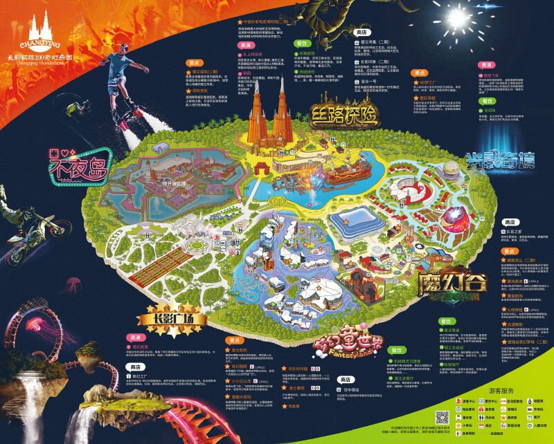乐园拥有四大主题分区,分别是:丝路探险、光影奇境、魔幻谷、梦幻童世界;大型游乐项目全部采用创新影视特效技术,与量身定制的世界先锋娱乐设备完美结合,创造超越电影,身临其境的奇妙幻境。