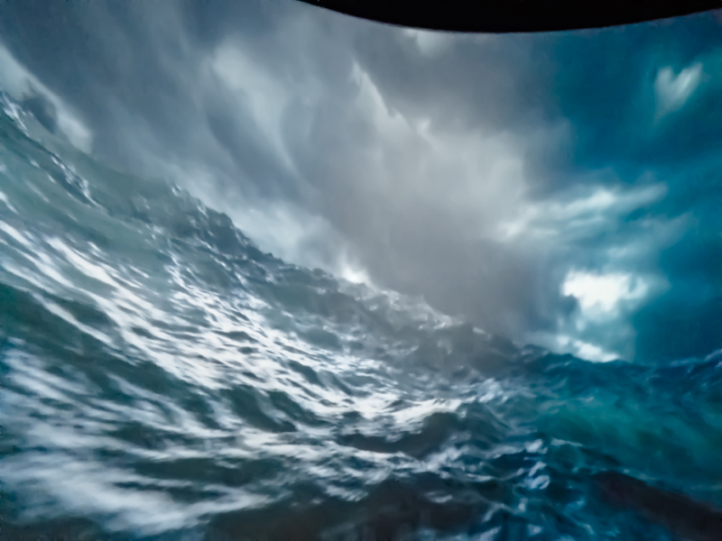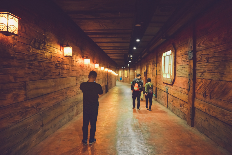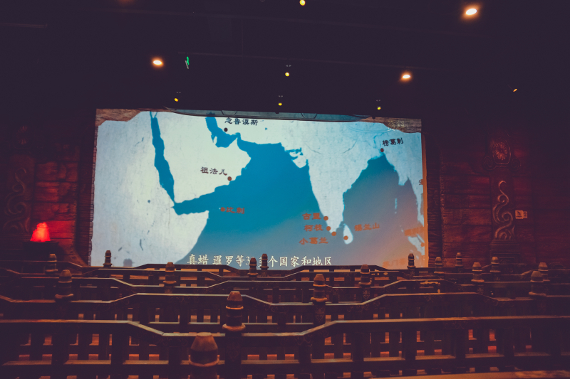 从船底的入口登上宝船,经过一条长长的走廊,里面是一个演播大厅,是那种模拟真实场景的大荧幕,座位会模仿船的摆动,就好像回到明朝盛世,追随编队整装起航,与滔天巨浪抗争,和未知敌人激战一样,十分奇特的体验,再现了海上 丝绸之路 的瑰丽航行。