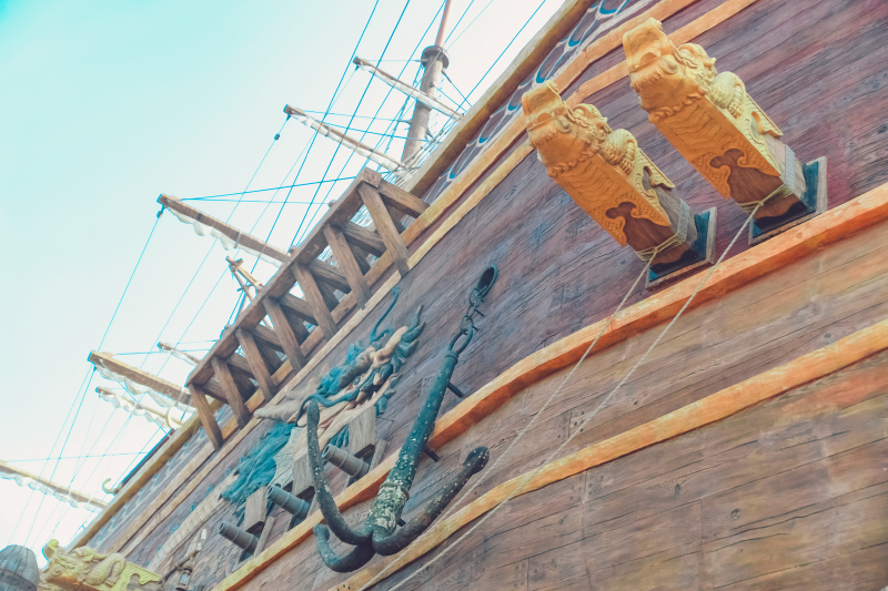 一艘巨船停靠在距离楼兰古堡不远的岸边,高高的桅杆屹立空中,洁白的船帆在风中舒展。这是一艘几近完美地还原了郑和下西洋时的巨型宝船。炮火的伤痕依稀可见,铁锚上的螺壳是岁月的积淀,战旗仍然挺立不倒,耳边仿佛传来海的呼啸、风的怒吼和战争的号角。