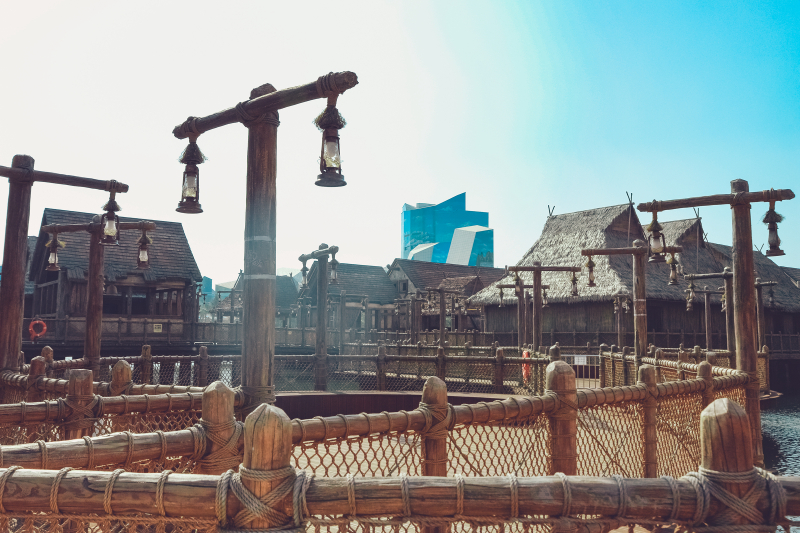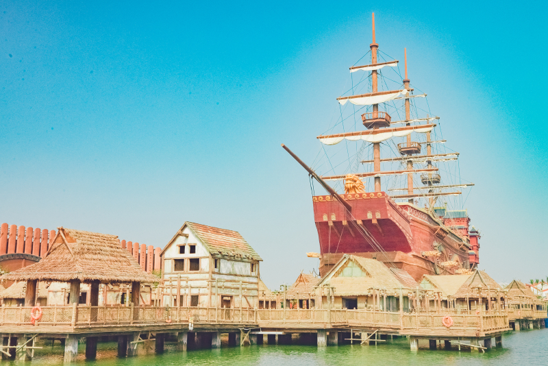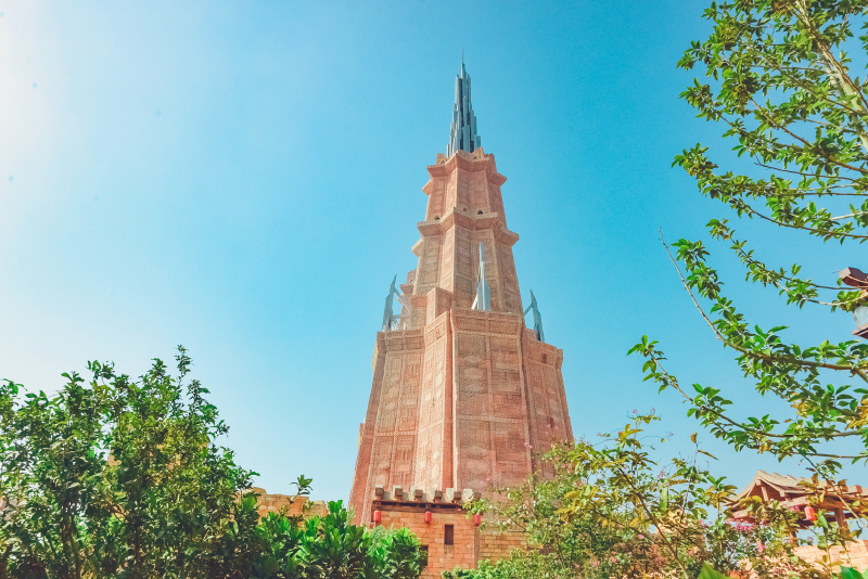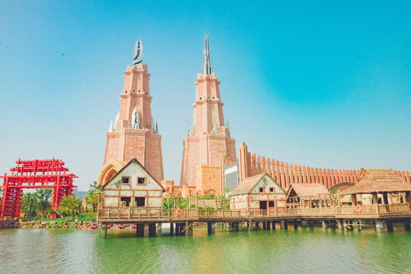 中国 区是神秘恢弘与中西文明交融的文化体验区。拥有园区标志性制高点建筑——高达150米的楼兰双塔和庞大震撼的巨型西洋商船,宛如远古圣殿般的电影博物馆,辅以极富现实感的渔村设置,让人在史诗徜徉中穿越时空,流连古今。