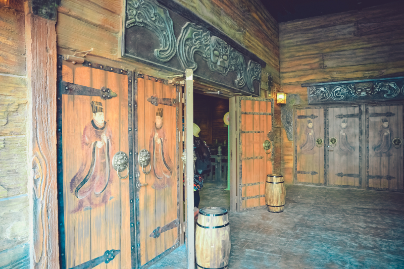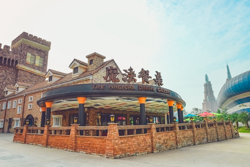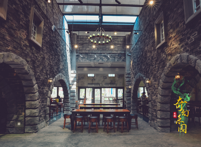 玩的嗨逛的爽难免饥饿体乏,整个景区分布着丝路面馆、西域烤吧、魔法餐桌、特工补给站、霸王龙餐厅和尚百味等众多的特色美食餐厅。走到哪吃到哪,对我吸引力最大的就是位于魔幻谷的魔法餐厅。