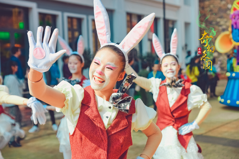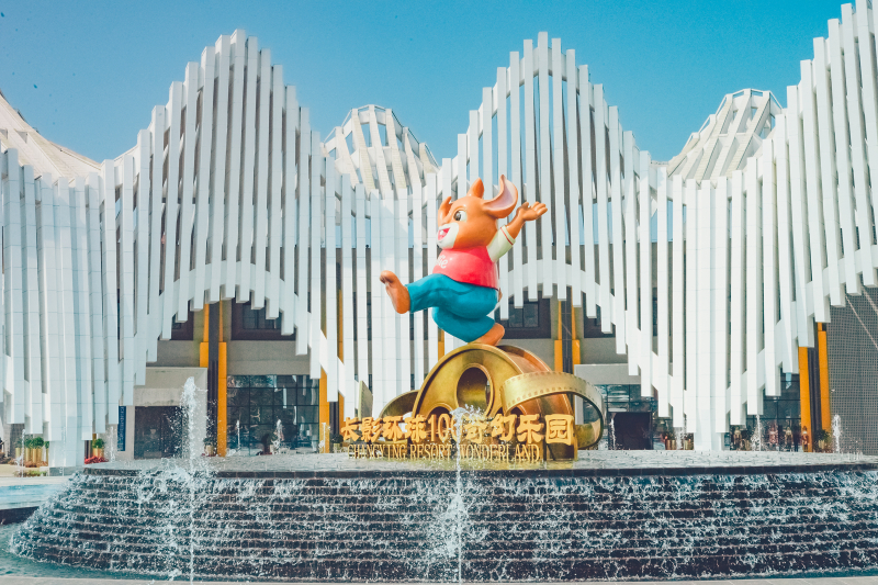 从市区打车到长影奇幻乐园大概需要20多分钟,从停车场出来就被偌大的奥斯卡广场惊呆了 ,广场中心的乐园形象大使是一只欢快的卡通小兔子,小朋友们看见兔子的雕塑可开心极了,又蹦又跳。