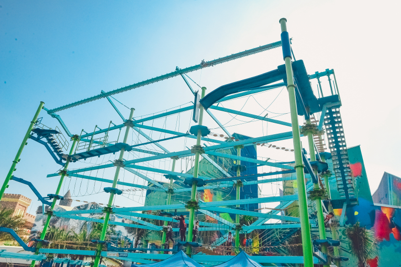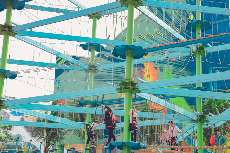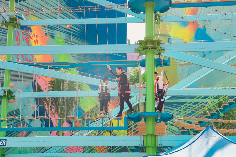 奇幻翱翔的隔壁是考验勇气的攀爬体验项目,大多参加的都是父母带着孩子,可以锻炼一下孩子的勇气,培养团结 互助 的品质,一个人不太容易通过,相互帮助才能完成的更好更快。