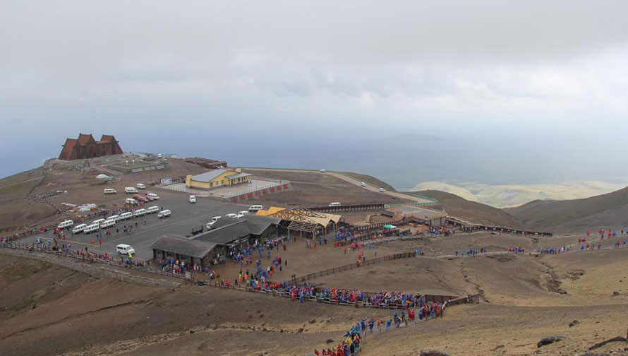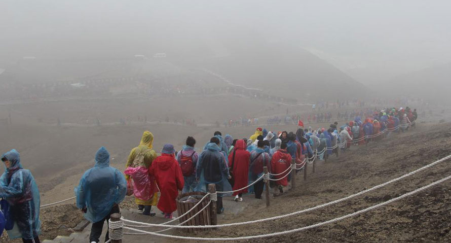 天池脚下有一片广阔的休息区,并作为上下山的换乘处。一到山顶,大家兴奋不已,登览天池的人排着长长的队,天空下起了细雨,我们忙穿上提前备好的雨衣,当穿上雨衣裤子时,嗖嗖直接钻裤腿的凉风一下子没有了,瞬间保温不少!并从背包里拿出来防寒服,大家每人一件纷纷穿上。然后跟着队伍排队上山。