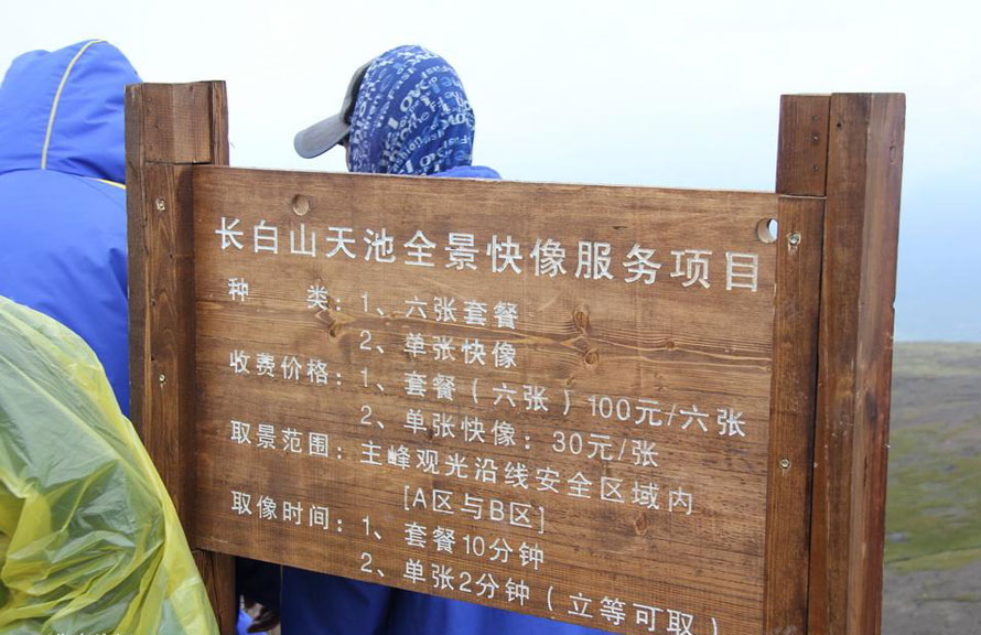 登天池的路线一共有A、B两条钱,B线是邓公当年游览的路线,并写了“天池”2个字,据导游说B线没有A线欣赏天池的风光好,我们选择了A线,A线人非常多,每隔几十米就有一个穿着厚厚的棉衣维持秩序的人,粗绳是分隔人流、缓解拥挤的“利器”,换乘中心乘车和登天池,中间都有一段有人用绳子把人流隔开,防止拥挤。几分钟的时间,天池就到了眼前,四面环山,一潭碧水,可惜天气极不好,我们在拥挤的人群中大概看天池总共不到10分钟吧,不一会儿雾就上来了,瞬间,天池像个害羞的女子就躲到云雾里去了。看天池的地方有点低,想要拍天池全景挺难,人群外稍微高点的地方被照相收费的占住了,拍照倒是明码标价:套餐6张100元,单张30元,套餐等10分钟,单张等2分钟。