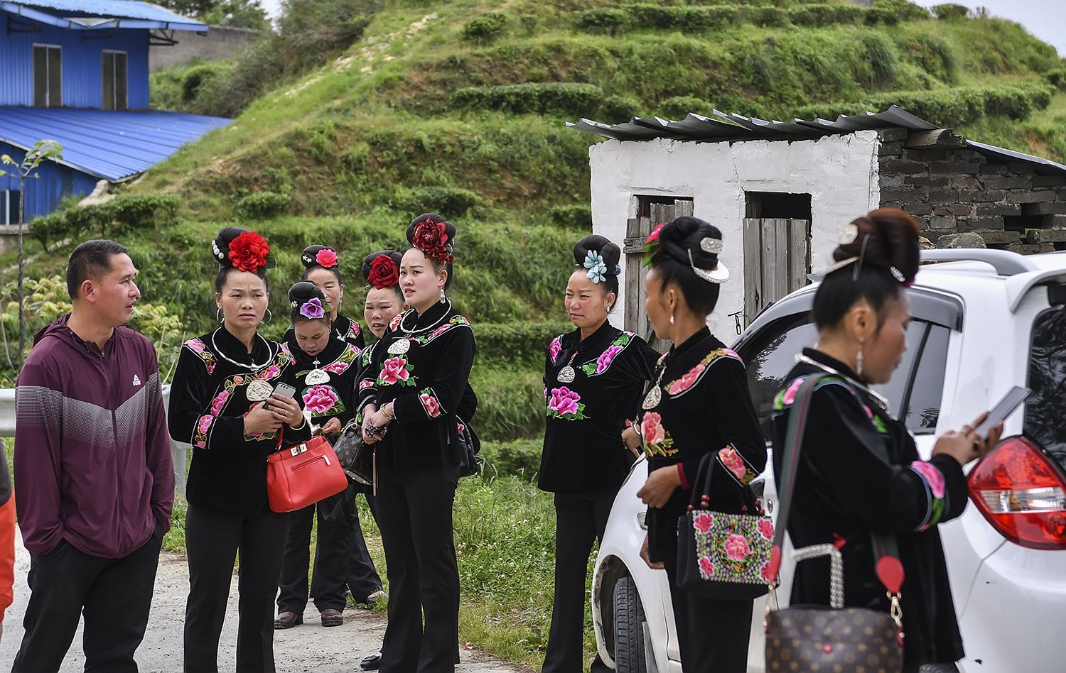 我们是下午二点从白岩村出发,前往“爬坡节”的主会场:掌排村龙根坳。果然不出村长所料:真的被堵在路上了。“爬坡节”一般都是由各苗寨自发轮流举办的,交通指挥也是村民负责的,上山的路车辆已无法通行了,大家都把车停在道路两旁,我们也只好弃车步行,还算运气,只要再爬二十来分钟,我们就能到达主会场。