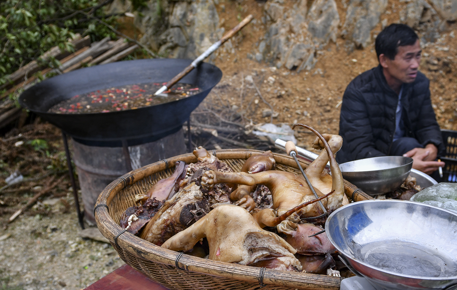 看看这卖狗肉的,已把大铁锅支到路旁边,锅中麻辣底料还冒着热气,各种小吃的摊点一直漫延到山顶,形成了美食一条街。