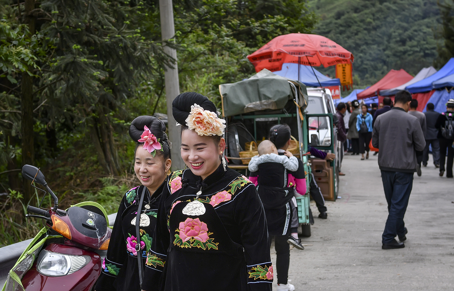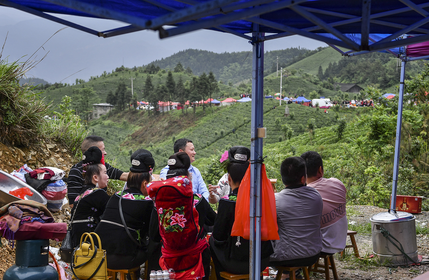 黔东南雷山的“爬坡节”一般设在“谷雨”前后,是一年一度特有的择偶恋爱的欢聚盛会。一路上还有不少苗民赶来过节,他们大部分都着民族服饰。越往上爬,感觉有点像是在赶集,路两旁摆摊设点的多了,聚会的人也多了起来。