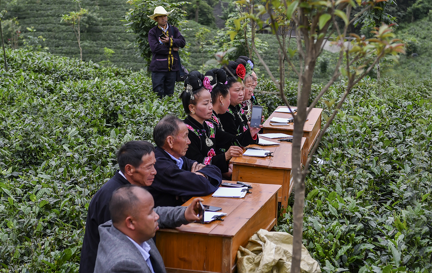 这是评委席,三张木桌置于茶树丛中,后面端坐着八位评审大人,正在聚精会神地聆听歌手们的演唱,这敬业精神场面着实让我感动。脑海中冒个奇怪的想法:就是想知道他们的评审费有多少?