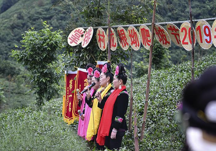 终于到了龙根坳爬坡节的苗歌赛场,就是在茶山之上搭建了个小舞台,选手们走在茶树中间进行对歌,虽然有些简陋,但丝毫不影响观众的热情,围观者众多。这样别开生面的歌会,我还是第一次见到。