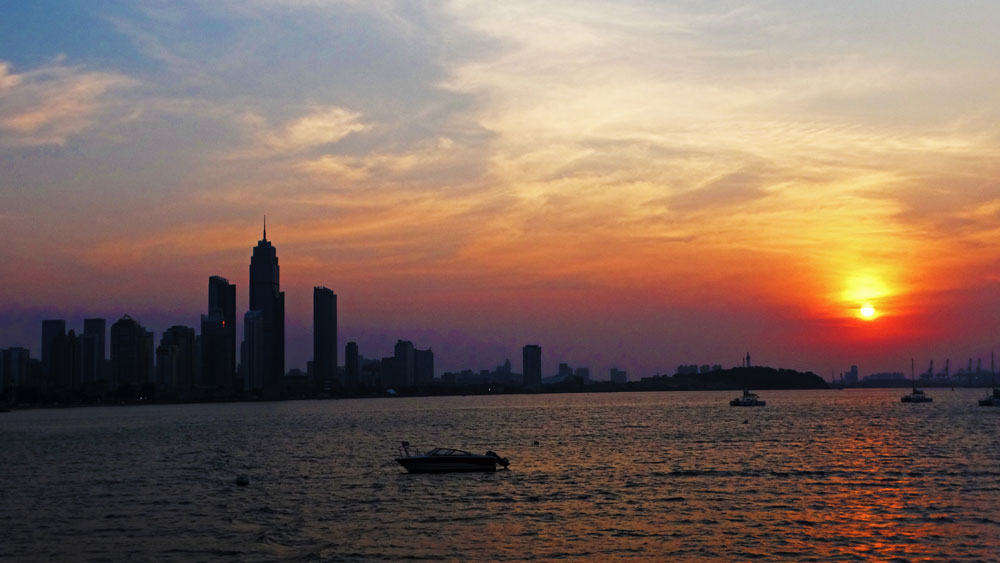 在暮色里穿行的时候,海风正盛,海边的楼宇与草木沐浴着晚霞,夕光洒落海面,闪着粼粼的光。