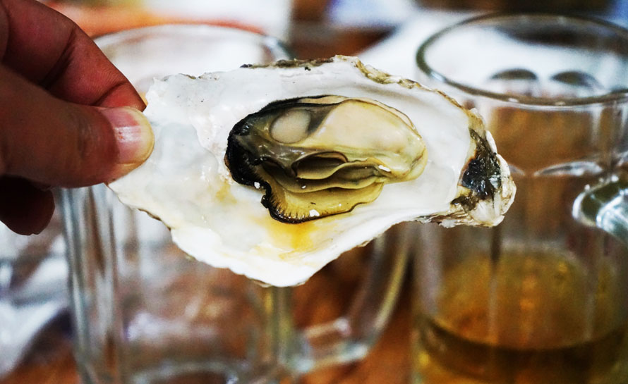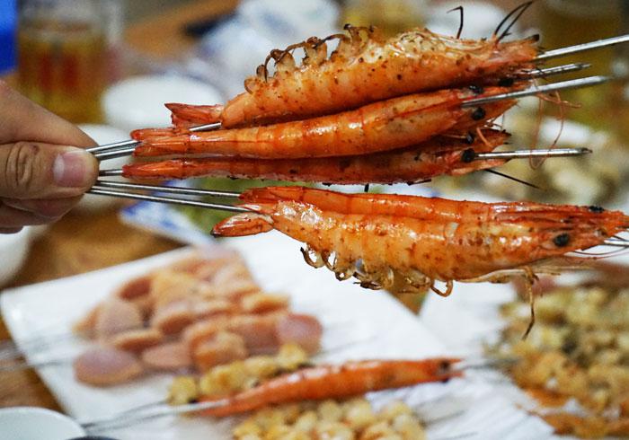 果然,所有的食物基本都是海鲜,生蚝、扇贝、蛏子、花甲、基围虾等等,羊肉串似乎不是这里的吃食。“我们这里烤的肉串是五花肉”,老喻说。