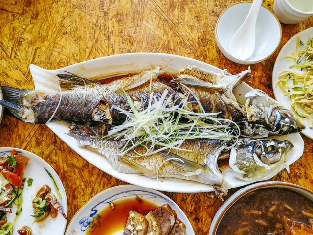 餐厅对面就是湖,吃的鱼都是湖里钓上来的1-2斤重的大鱼,湖里的水是山泉流下来汇聚而成,我们吃的清蒸草鱼,鱼肉肉质鲜嫩,入口即化,无一丝草腥味,再一浇汁,鲜美极了。上桌秒没!