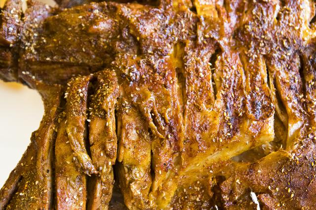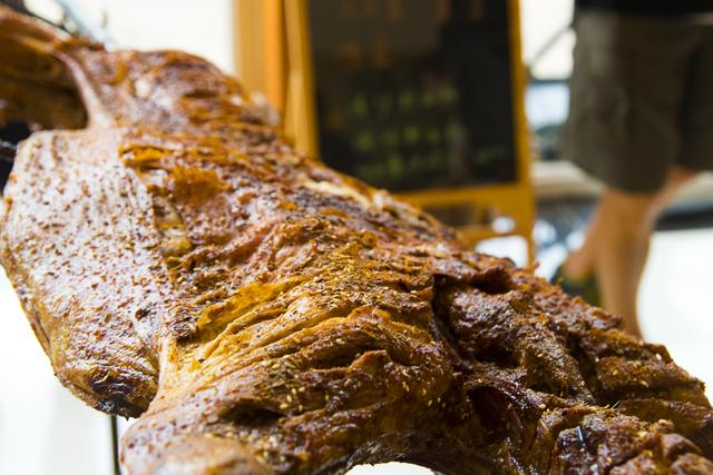 在大家的印象中,烤全羊应该是装在盘子里面端上来的连骨头带肉的一大堆零碎。但这只烤全羊却是整只被抬上一个架子,大家直接戴上手套到上面撕肉吃。喇叭沟门是满族自治县,这里的烤全羊是传统的满族式的烤全羊,这种烤全羊的烤法是直接把调料刷上去,边烤边用刀子把羊肉割开呈鳄甲状,让调料的味道渗入到羊肉里面去,先把表面一层烤熟,然后让大家动手撕肉吃,第一层肉吃光后再重新刷料再烤下面一层,如此这般,一般要反复烤三次才能将整只羊吃完。
