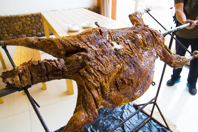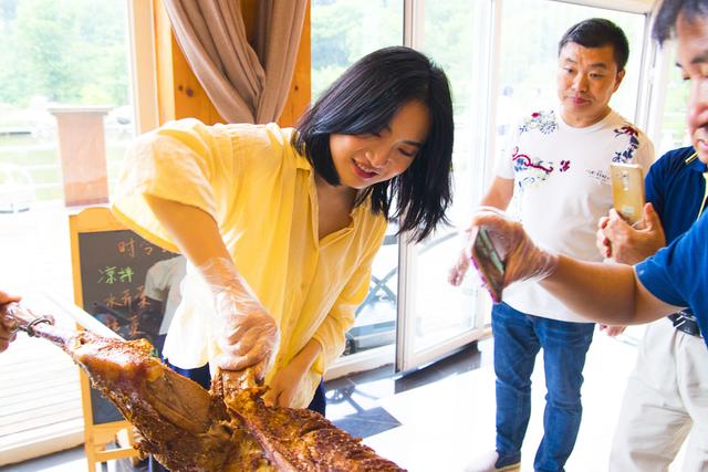 但大家对于室内就餐区域兴趣不大,要求把餐桌放到湖边的平台上,老板欣然照办,可谁知,饭菜刚摆好,天却下起雨来,无奈又只得搬回到餐厅内。经过这番折腾,大家稍觉不美,但很快就被焦黄流油的的烤全羊吸引了眼球。当烤全羊抬进来的时候,大家全都睁大了眼睛。
