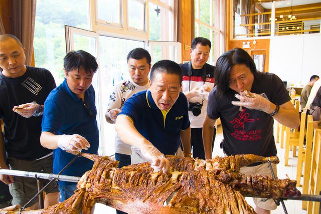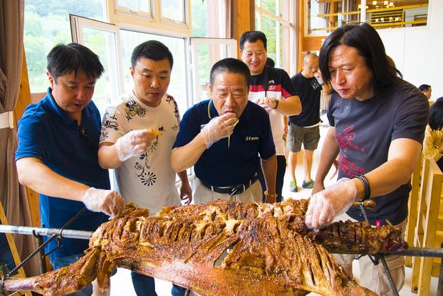 而满族人却一直是个定居的民族,他们的前身是女真,是在白山黑水间生活的林木中百姓。历史上曾经占据过北京建立过大金国,就是跟岳飞打仗的那个金国。相比之下满族式的烤全羊工艺更细致,味道更香浓,但由于他们不是以放牧牛羊为生,他们吃牛羊肉的名气不如蒙古人大,所以知道的人不多。以前在离此不远的丰宁大滩的中国马镇也吃过一次这样的烤全羊,烤法与此完全相同,大滩也是满足自治县。满族人的烤全羊基本都是这样做的,这是一种传统,当年的努尔哈赤和皇太极也是这么吃的。