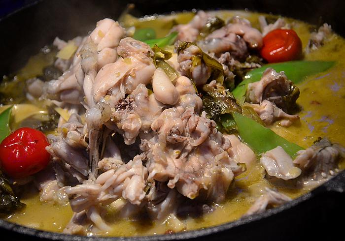 炭烧牛蛙泡锅(老坛酸菜味),嫩白大块的牛蛙,金黄的汤汁,点缀着红彤彤的泡椒,滋味酸爽无比,吃肉喝汤,惬意满足。