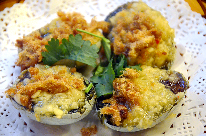 烤皮蛋,在皮蛋上加入了蒜蓉、肉松,烤后皮蛋的清香加上肉松的浓香,好吃的不要不要的。
