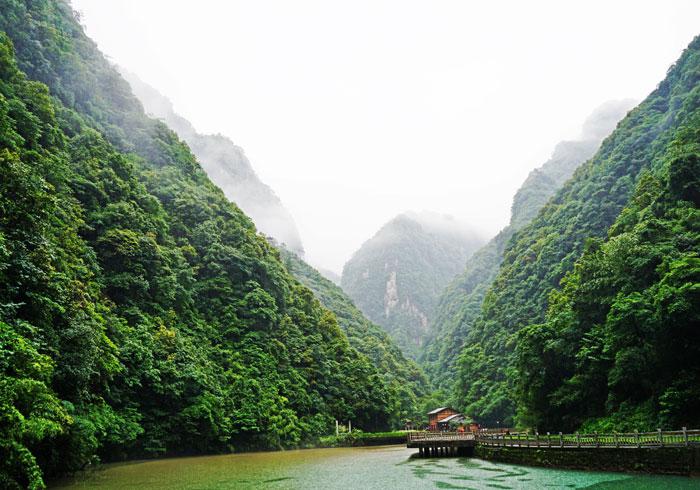 出重庆市区东南偏南约1个小时的车程,便抵达了原始峡谷神龙峡,这里植被茂密,层峦连绵,山外的青山与云雾将这里描摹成天堂般画卷。站在一处山顶俯瞰,这里的形状呈“V”字型蜿蜒在崇山峻岭之下,峡谷内河流蜿蜒,浩荡着奔向未知的远方。