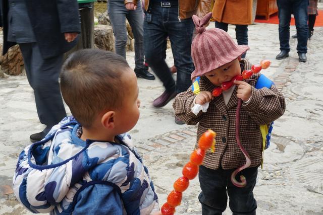 吃货街是小朋友的天堂,小帅哥专心啃着糖葫芦,一副六亲不认的模样。