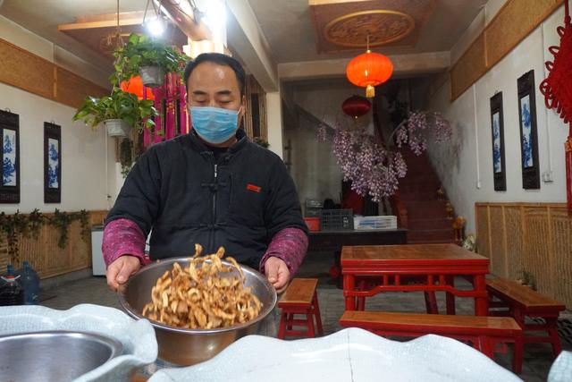 第一次见到新鲜蘑菇进油锅烹炸的吃法,大叔将蘑菇撕成条,热水煮熟,拌入鸡蛋、面粉、五香粉制成的糊糊,油炸后出锅用椒盐搅拌调味。