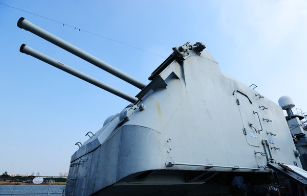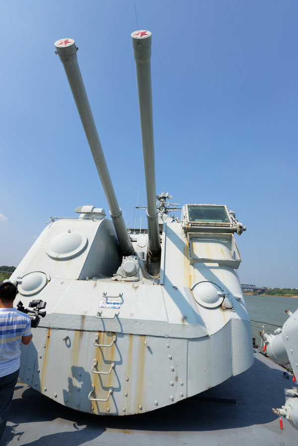 南昌舰的主炮,因为炮口口径为130毫米,简称为130双口径主炮,它的威力十分惊人,6枚130舰炮基本上可以使一艘3000吨级的舰艇失去战斗力。从外形看,具有明显的仿苏联痕迹,体积庞大,隐形能力差,防护能力弱。它主要是用来攻击对岸,以及大型舰艇和货轮。射程为30公里,最高可发射到20公里以内的高空,在舰首和舰尾,一共有两架。