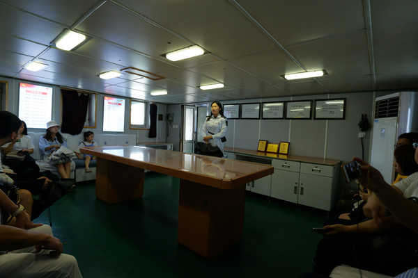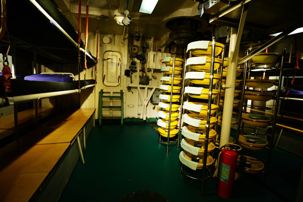 我们来到了负一层海军兵仓,这个兵仓面积较为狭小,但足足容纳了54名士兵。我们可以看到,每一列有上中下三层床铺。一旁的摆放的则是生活用品,毛巾的摆放也有规定,从脸盆垂下来要刚好四指宽。以前的兵仓也是有空调的,但是受到电压负荷量的影响,空调开放时间主要为战士们午休和晚休的时间,条件艰苦,不禁对163南昌舰士兵肃然起敬。
