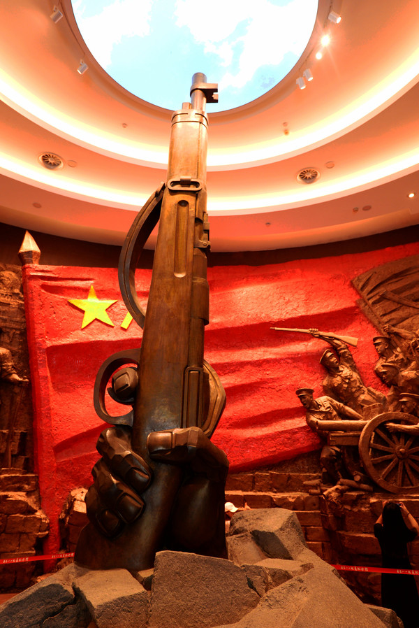 旧址后面新建了一栋楼,叫陈列大楼,刚进去就看到一个雕塑,叫“石破天惊”,底座是崩裂的石块,一只有力的大手,从崩裂的石块中伸出,紧扣着步枪的扳机。
