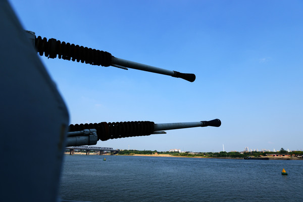 眼前的是前副炮平台,在平台上分别摆放着几座副炮,简称37炮,是我国自主研制的第一代防空舰炮,曾经占据了我国海军舰艇副炮的主要地位,主要是针对空中目标,比如飞机、炮弹,以及海上的小目标。两边的则是25炮,炮口口径为25毫米,主要用于对空对海和岸上目标射击,曾大量生产,广泛装备于我国海军导弹艇和护卫艇。