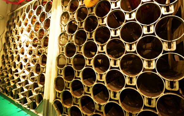 如此大体积的主炮是如何存放的呢,现在去弹药库看一看。这边布满了许多圆柱形的框架,它们都是用来存放130主炮的,由于体积过大,弹头和弹身是分开存放的。较小的部分是用来存放弹头,较大的则是用来存放弹身,这样存放方便传送。