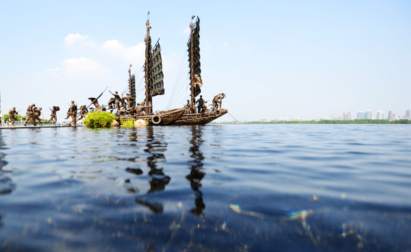 最大的亮点是有一个扇形大水池,在视觉上与赣江融为一体,几艘渡江船正迎风破浪扬帆启航,要朝对岸划去。