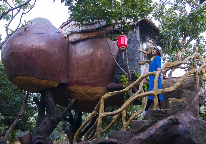 最有意思的是那个栗子树屋,这是那是这里的老板独出心裁设计搭建的,外观像是一大一小两个栗子并排在一起。看上去富有创意。室内也像一个栗子壳的内部一样,还有一个类似太空舱一样的窗户,可以看到外面,门口还有一个小露台,客人可以在树冠里乘凉品茶。
