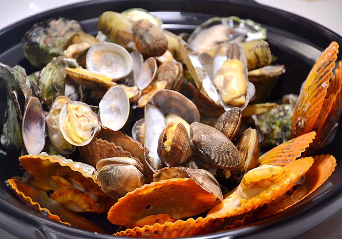 极品蚝贝拼盘,满满一大锅,有扇贝、生蚝、老蛏、花蛤等,一道菜就能吃到多种海鲜,十分过瘾。