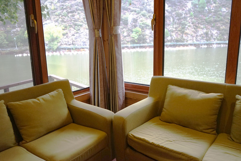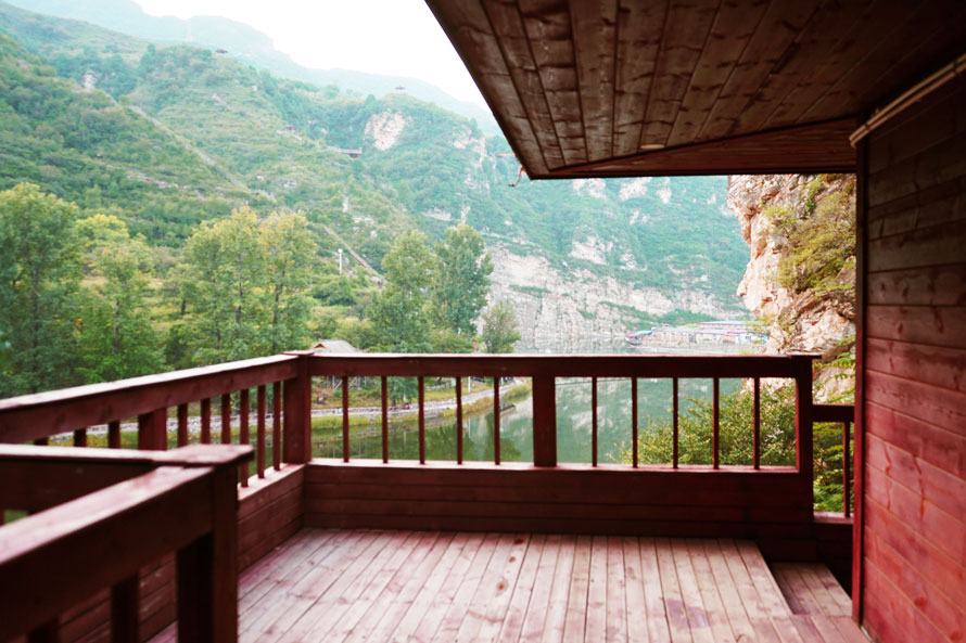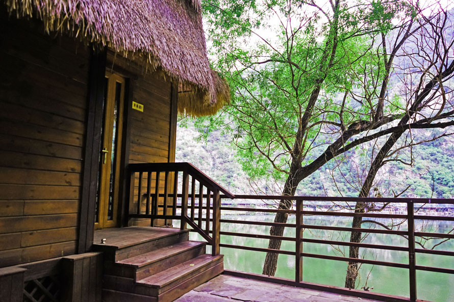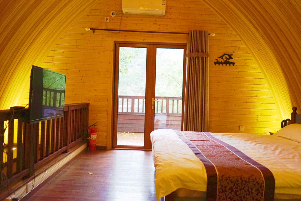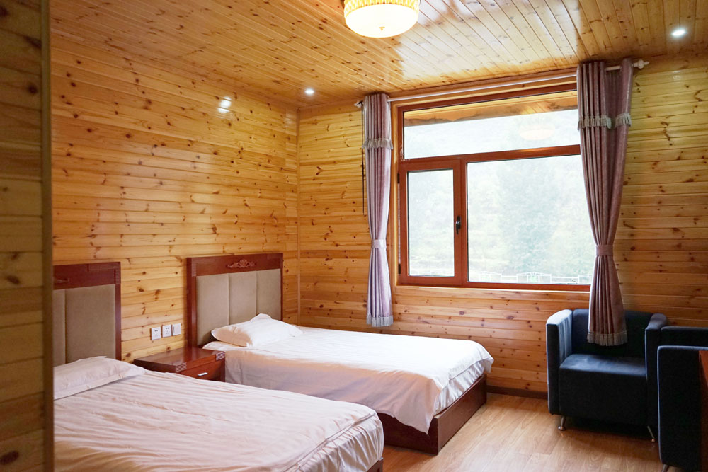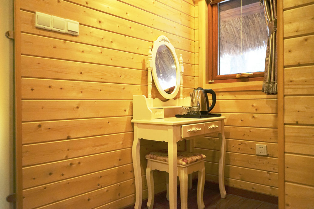 小木屋为复式结构,下面标间,上面是一张大床,两个空间均为独立的设计,并且有独立的卫浴。二层的大床房尤其招人喜欢,因为有一个阳台置于屋外,两座一桌,再泡上两杯茶,坐在那里,看夕光洒落湖面,听微风划过树梢,山空草净,偶尔有一两片落叶飘下,像极了世外。