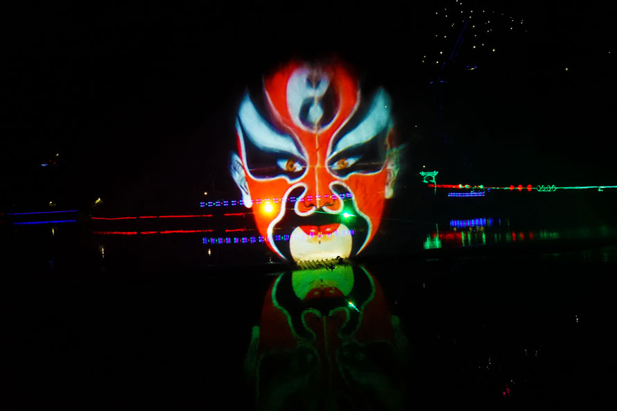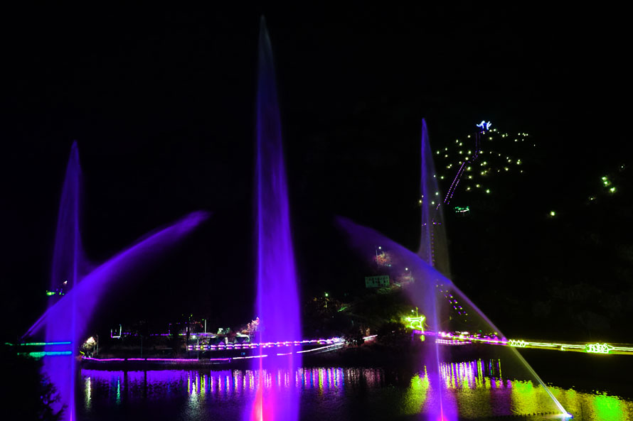 这个季节,山谷里的夜颇有些寒意,但小木屋里的暖气顷刻间就将之驱散,当然,如果你愿意,也可以在室外仰望星空,天幕下的星空贼亮贼亮,与城市的夜空完全不是一个概念。也可以在湖边看一场水幕光影,据说这样的水幕光影在附近其他地方是没有的。当天色完全黯淡下来的时候,湖水中的喷泉随着音乐舞动摇摆,然后幻化成一幕水雾,水雾相当于我们看到的电影幕布,画面就这样投射上去,一段故事就此展开。