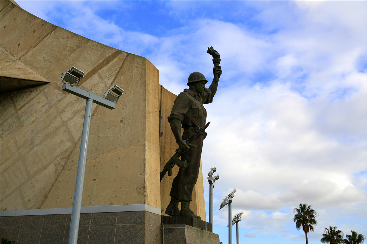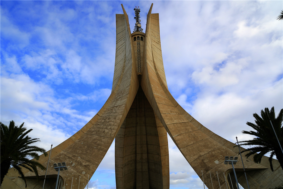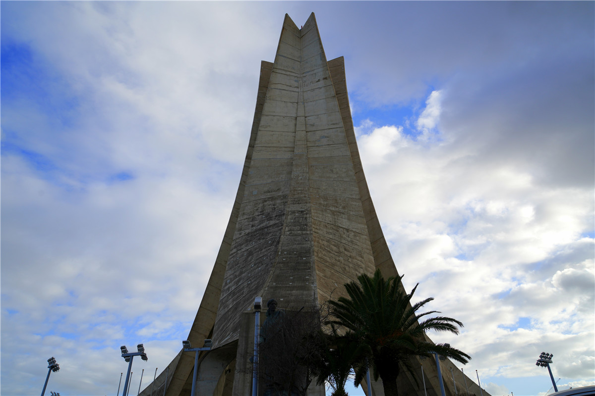 从摩洛哥出发,开始对第三个北非国家阿尔及利亚进行参观。飞机落地首都阿尔及尔胡阿里·布迈丁机场,我们马不停蹄直奔首都地标性建筑——三叶塔。三叶塔是阿尔及利亚独立20周年纪念碑,位于海拔127米的马达尼亚区哈马山上,一面朝向碧波荡漾的地中海。纪念碑由波兰人设计,它的塔高92米,整个塔呈现出三片由外向内斜立的棕榈叶状,据说象征工业、土地和文化三大革命,所以被人们称之为三叶塔。三叶在45米高处交汇,交点以上有5层,4层用于通讯,一层供参观,可俯瞰阿尔及尔湾,眺望阿尔及尔全市。三叶根部各有一尊雕像,分别代表阿历史上的抵抗运动、民族解放斗争和国家人民军战士形象。由于当天有外国军事代表团参观,我们没能近距离参观纪念碑,只是远距离进行拍照以及俯瞰首都。
