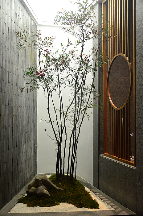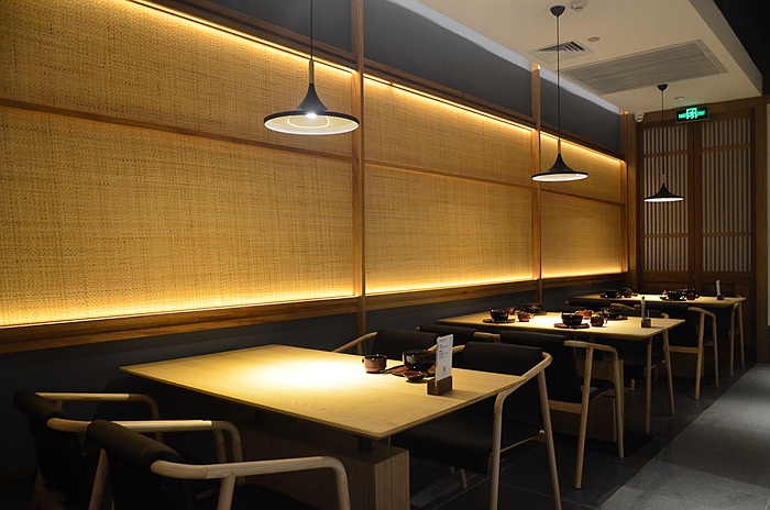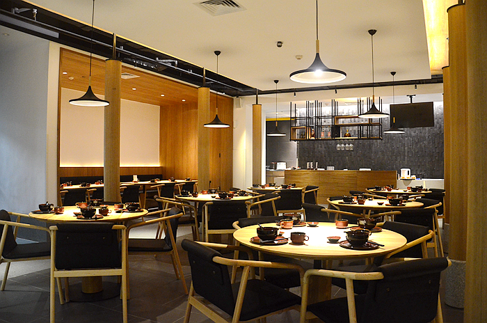 餐厅内清新素雅,移步换景,古朴的石底木柱,也是按客家古建筑的样式设计。