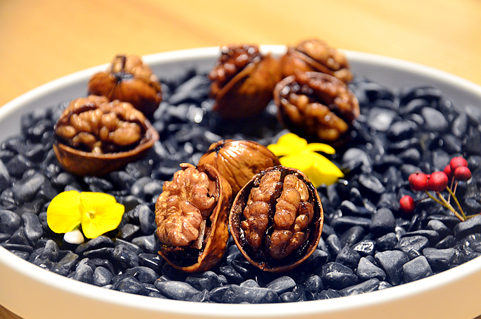 话梅薄皮核桃, 摆盘美轮美奂,洁白的盘子,黑亮的小石头,剥开一半壳的核桃,点缀着花花草草,很有意境,核桃酥脆清香,还带着话梅的微酸,画龙点睛。