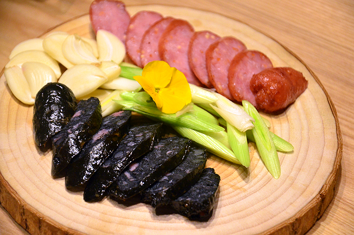 台湾香肠,香肠饱满弹牙,配着蒜片吃,浓郁的肉香加上清辣的蒜味,锦上添花。