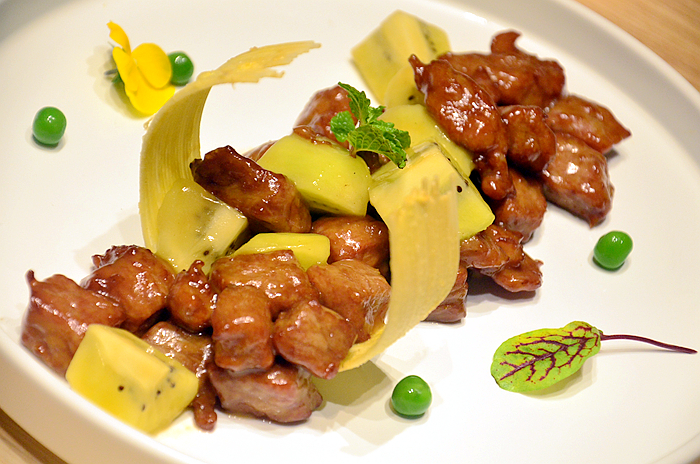 奇异果牛肉粒,牛肉粒色泽油润清亮,迫不及待夹起一块送入口中,嫩而弹牙,肉香中带着奇异果的酸甜芳香,结合的天衣无缝,相得益彰。