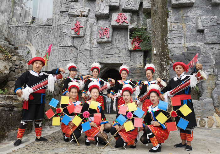 奇洞歌堂的演出就在溶洞举行,节目演绎瑶族先祖在远古时代历尽千辛万苦从湖南洞庭湖边迁徙至油岭安家落户、繁衍生息,其后从生产、生活中衍生出多种多样独具特色的民间文化艺术,如瑶族长鼓舞、排瑶民歌、刺绣、“讴莎腰(情歌对唱)”独特恋爱方式、礼仪,以及唯美、动人、浪漫的爱情神话传说,以天然溶洞的回声效果,用歌舞及生产生活场景展现出来,打造出原生态的视听盛宴。