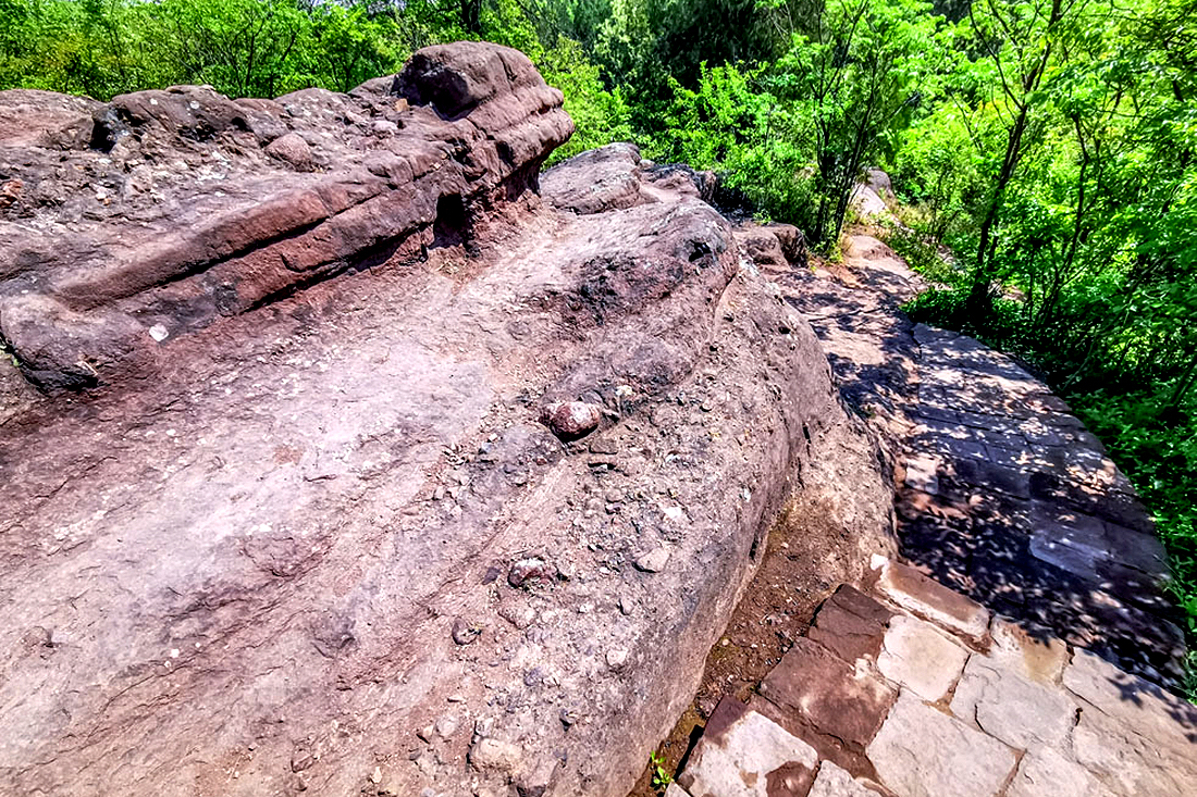 马陵山景区在新沂市南郊10公里,这里的地貌以丹霞地貌为特色,红色砂岩和砂砾岩峰林耸立,山势陡峭,红岩丹壁,其色如屋丹,灿若明霞。各种崩坍搭积地貌、陡崖地貌和以机械重力作用形成的洞穴景观掩映在绿树山林之中,红绿相间,相映成趣。这里不仅有山石,还有溪水、瀑布、湖泊,荡漾在自然的山水间令人心旷神怡。乾隆皇帝六度南巡、三幸此山,留下了“钟吾漫道才拳石,早具江山秀几分”的诗句,形象地赞美了马陵山的瑰美,并御封为“第一江山”。