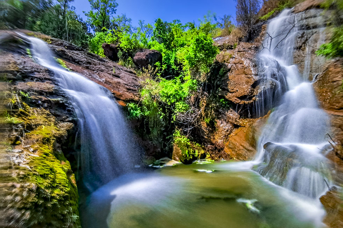 大龙沟的瀑布不是很大很壮观,但是它的水流恰到好处的从赤色的岩壁上倾泻而至,像一条白色的飘带缓缓而至。有的是一股,有的是两股,最多的有三股,最终形成深浅不一的潭水,清澈可见底。水不在深,有龙则灵。