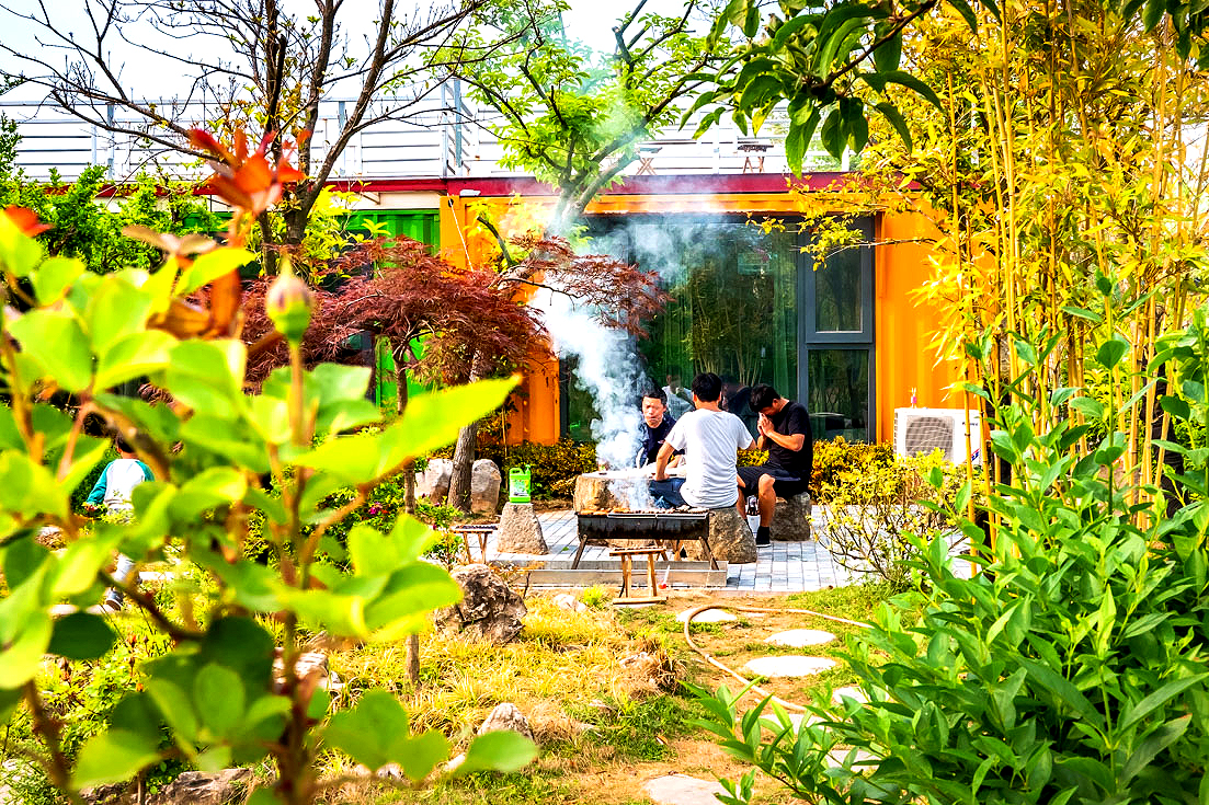 露营地占地面积70亩,共有集装箱式套房30套,每套集装箱民宿占地300平方,均配有1院、1卫、1厨、1客、2卧。