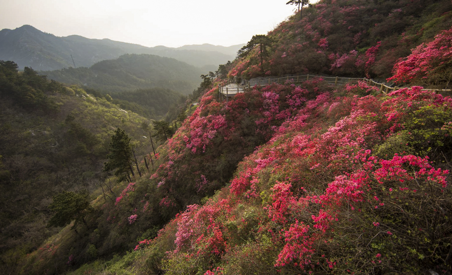 花喜人悦,春歌风吟。绚烂的杜鹃花一枝枝,一簇簇,绽放在晨光里,悄然开满山岗。拔开朦朦晨雾,翘望春的来路,一团团,一片片,像晨雾里的火炬,似彩云中的霞光。“何须名苑看春风, 一路山花不负侬”。