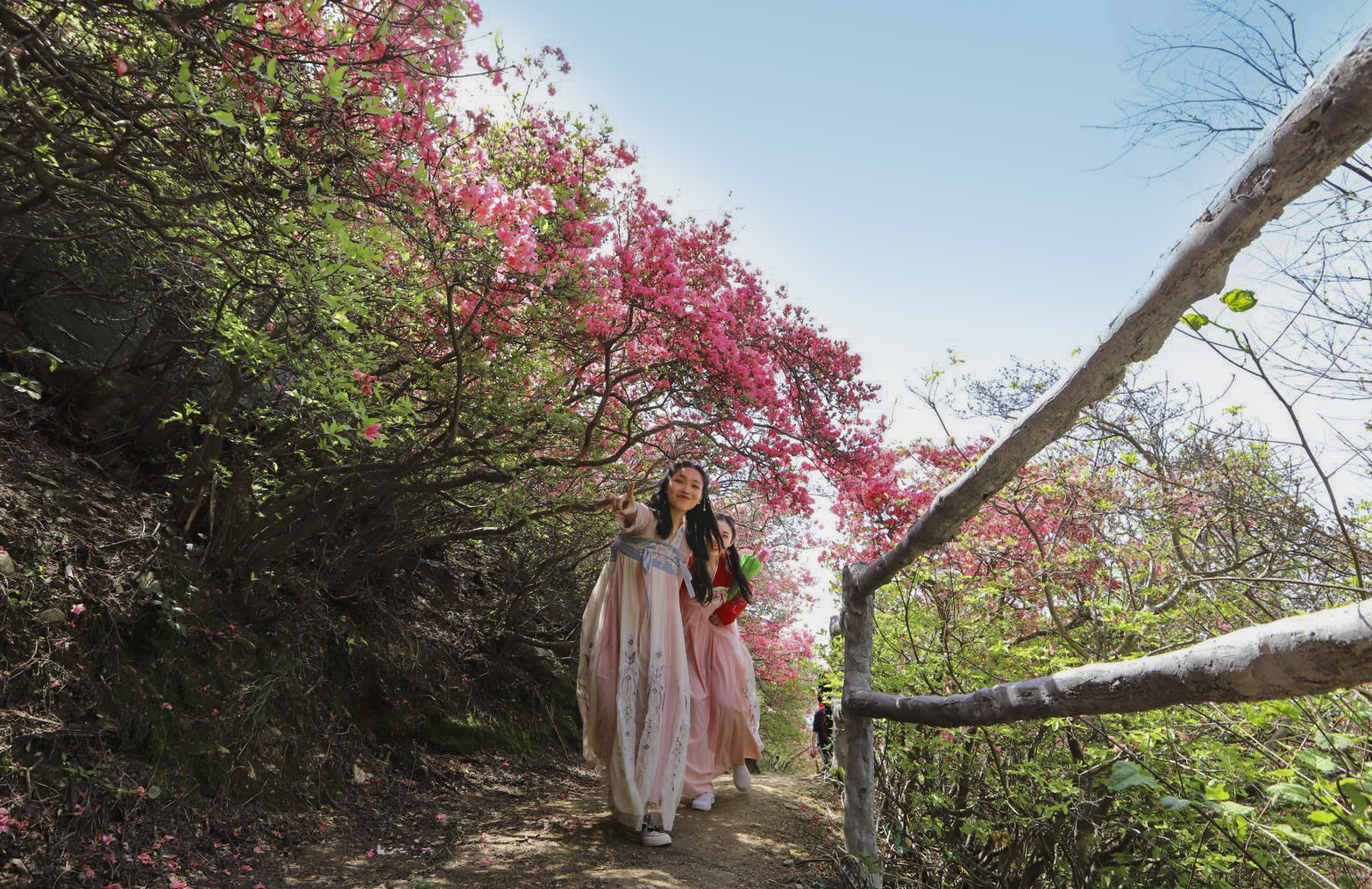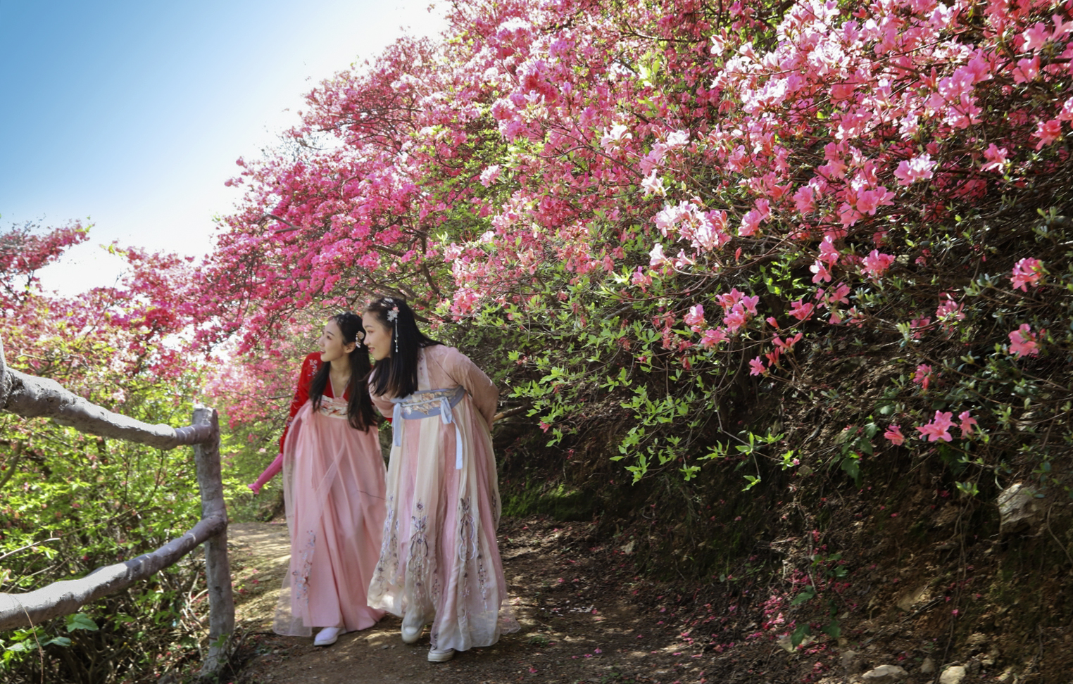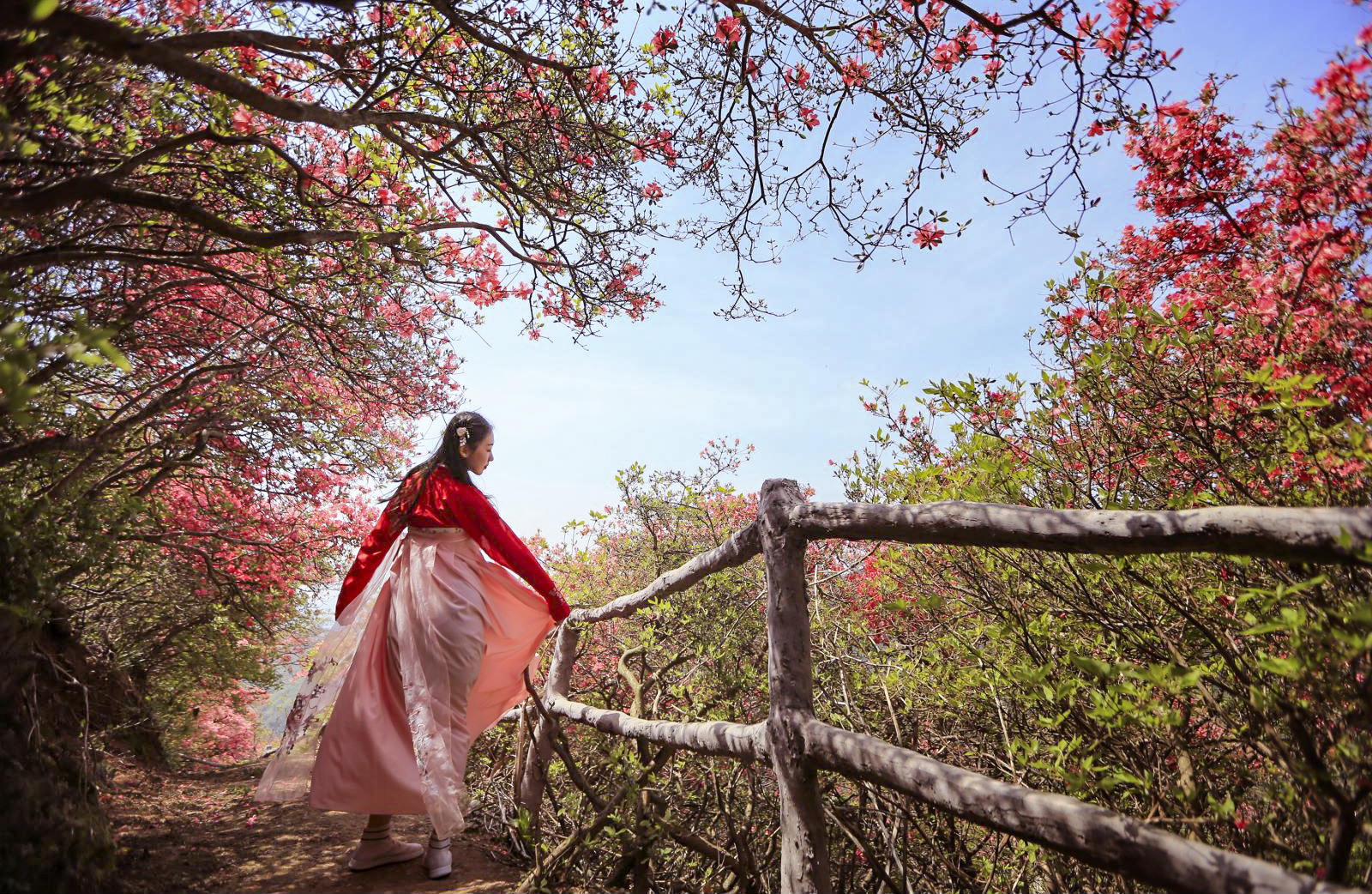 我是追随着两位着汉服的小姐姐,一路穿行于这花径之中的,她俩如同二只蝴蝶,飞舞在这杜鹃花海之中。虽然我们不曾相识,但似乎保持着默契,她们只管美丽,我负责定格精彩;她们得到了美片,我获得了生动的画面,各取所需,哈哈。
