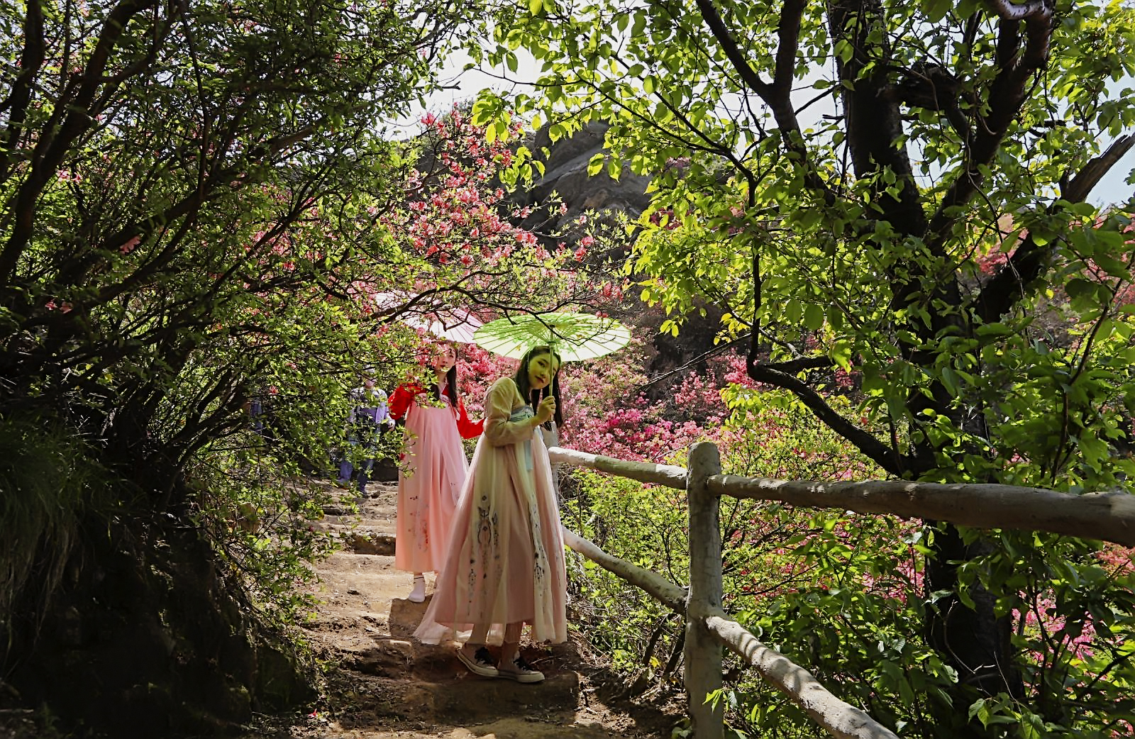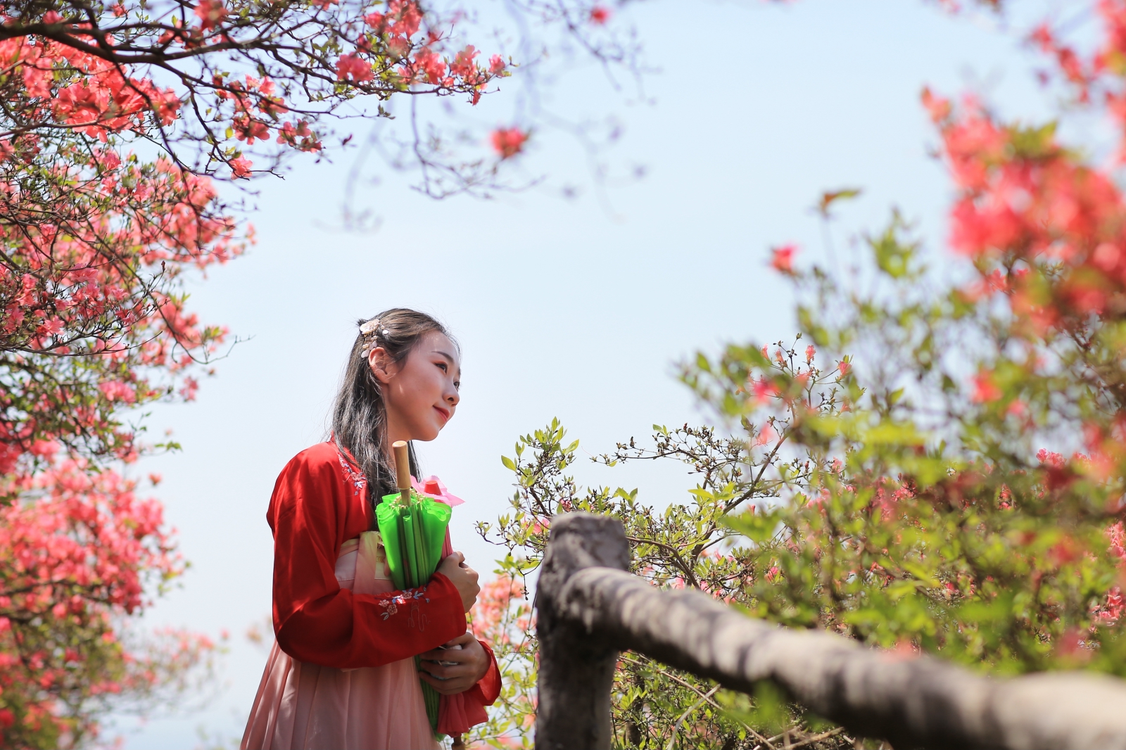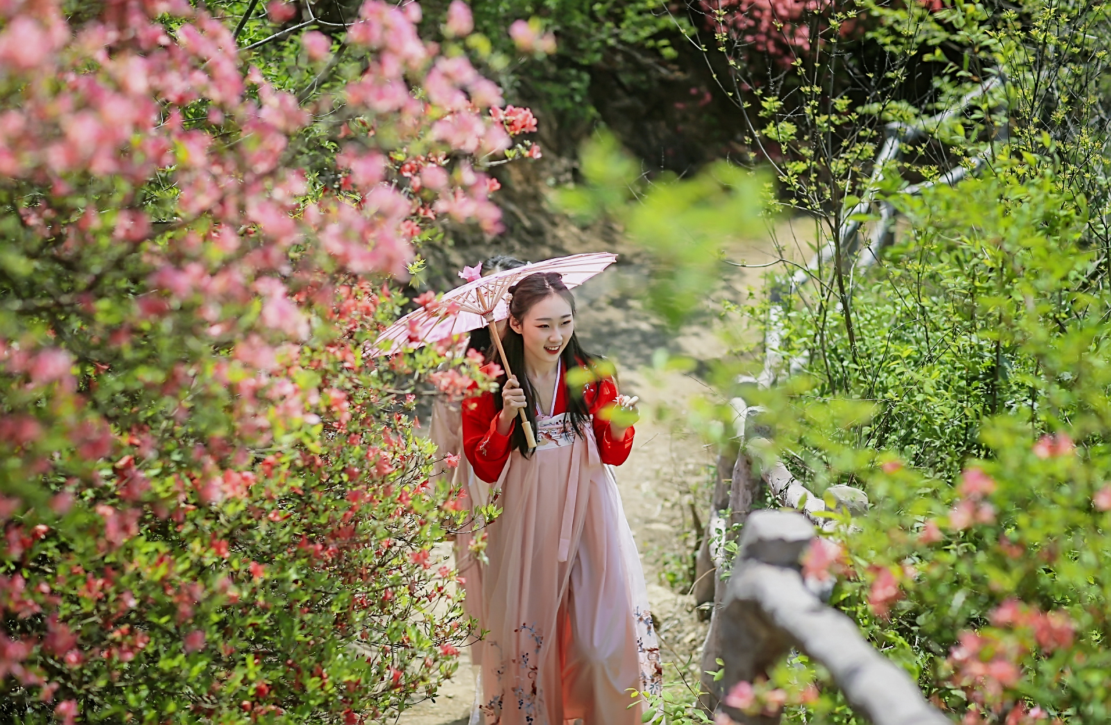 我是追随着两位着汉服的小姐姐,一路穿行于这花径之中的,她俩如同二只蝴蝶,飞舞在这杜鹃花海之中。虽然我们不曾相识,但似乎保持着默契,她们只管美丽,我负责定格精彩;她们得到了美片,我获得了生动的画面,各取所需,哈哈。