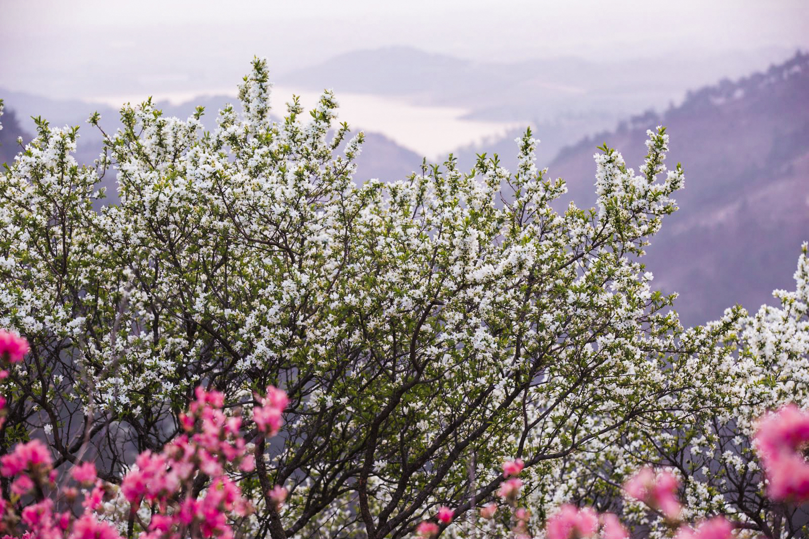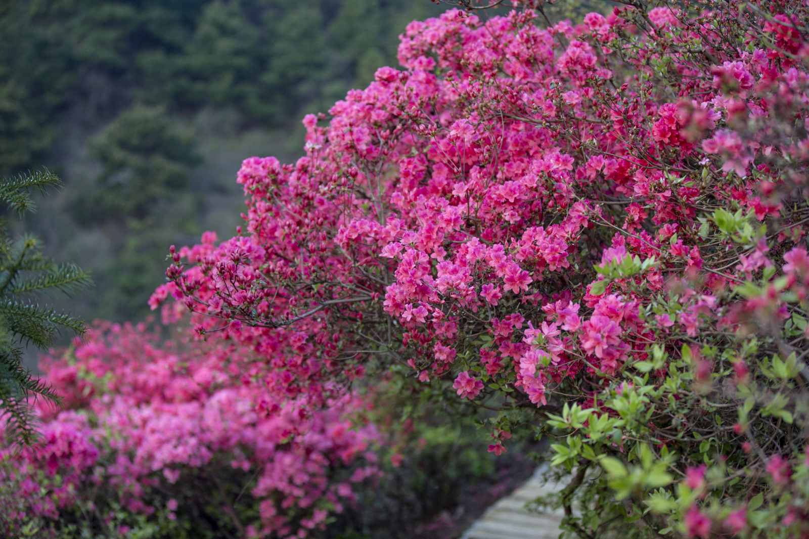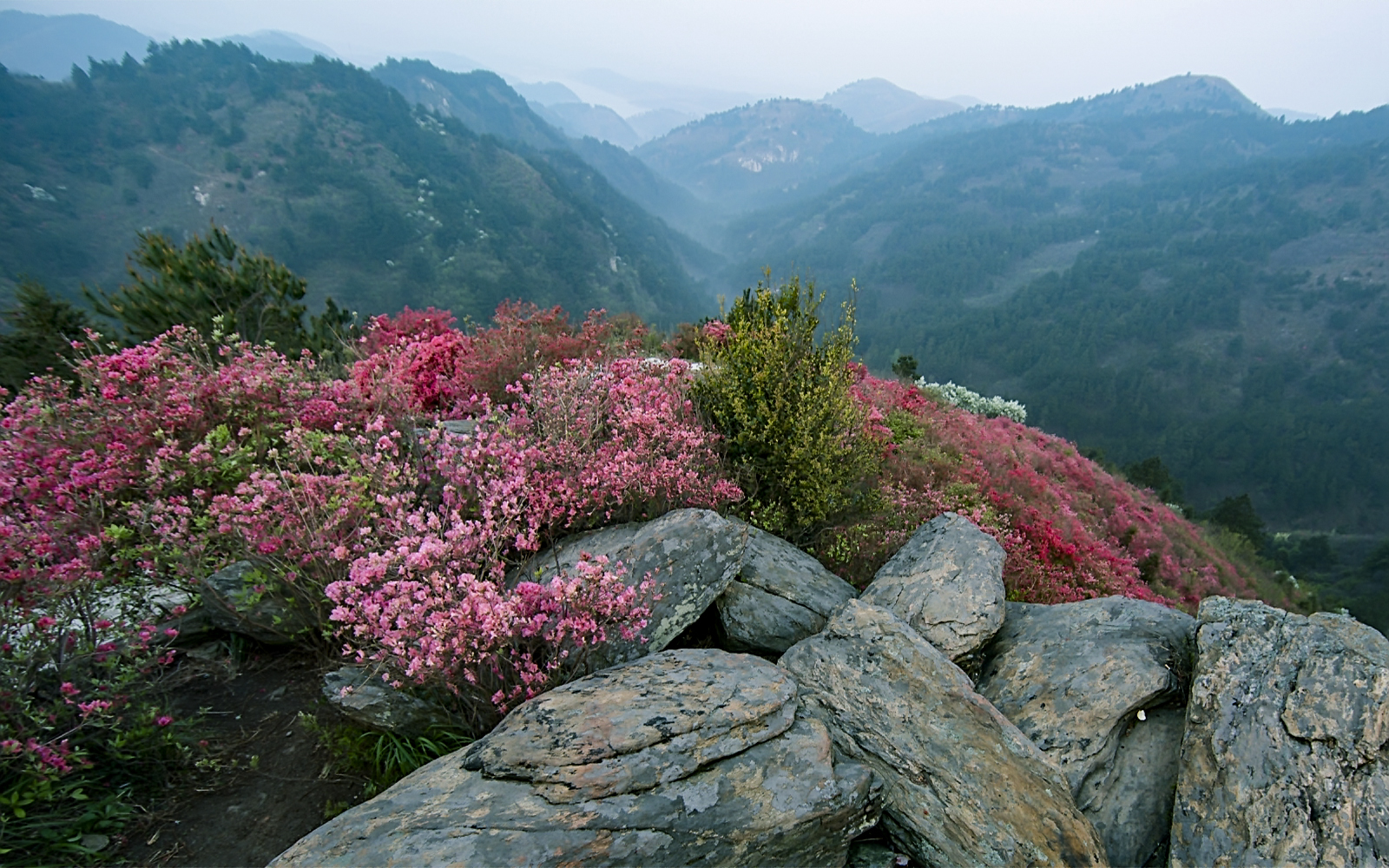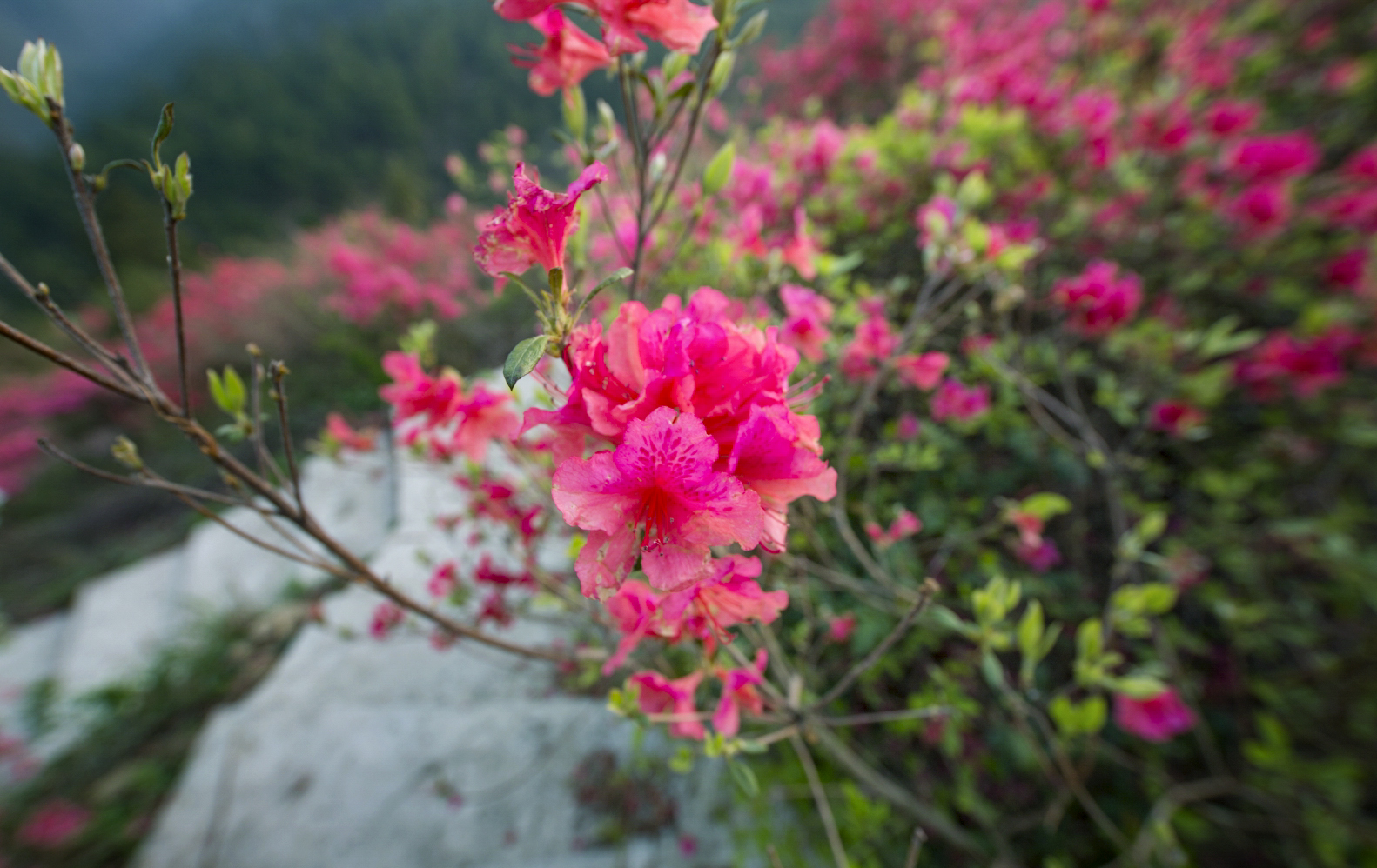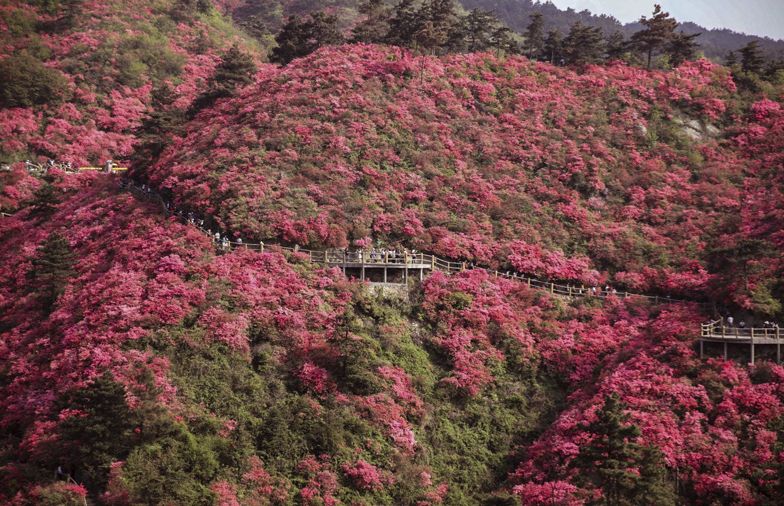 世上的杜鹃花品种有900多种,而在云雾山就有500多种。由于地势起伏、海拔高低的差异和品种的不同,即使在同一座山上的杜鹃花,花期也不尽相同,有的开花早,有的开花晚,盛花期可以从3月中下旬持续到5月中旬。
